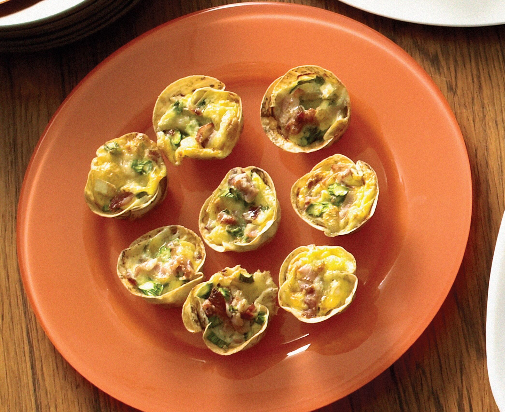 Using a tablespoon, fill the prepared mountain bread cases evenly with the quiche mixture.